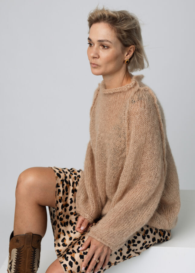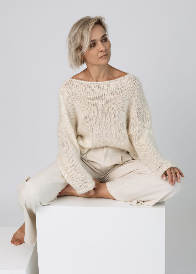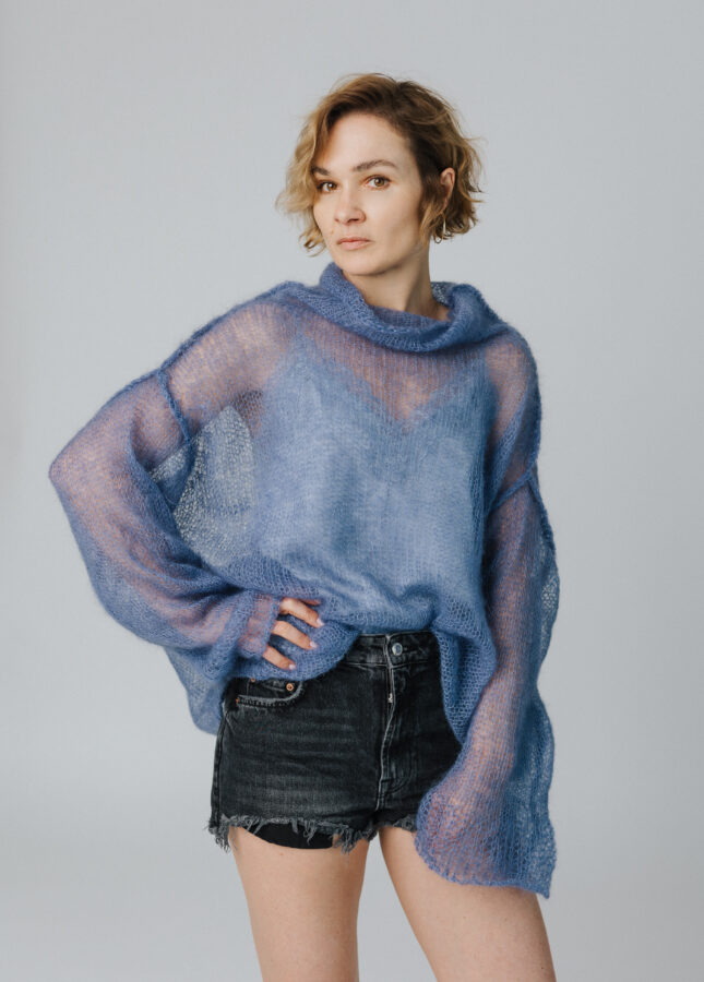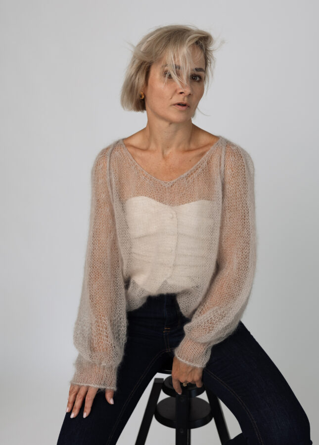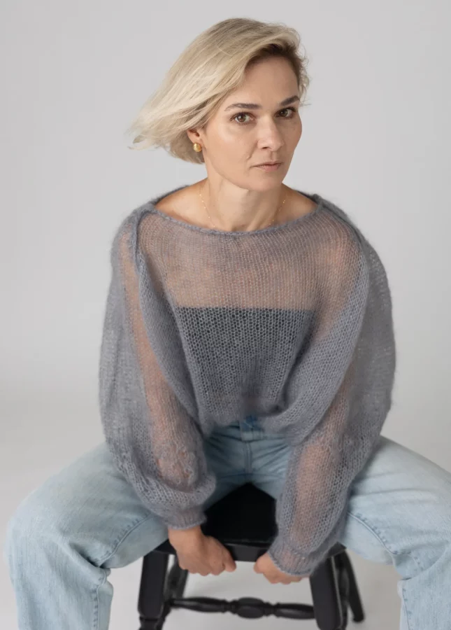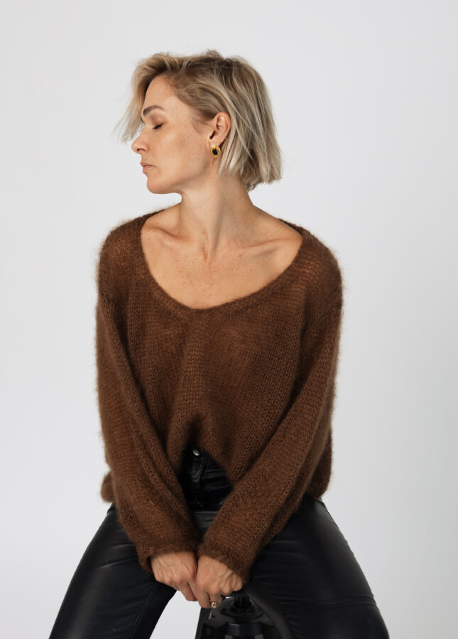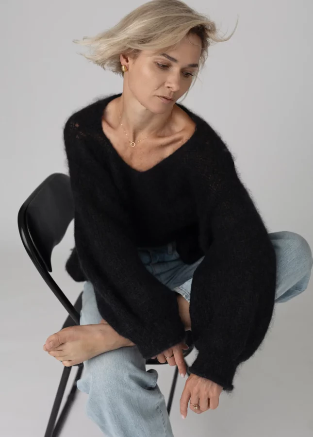 Puszysty sweter wykonany z podwójnej lub potrójnej przędzy moheru z jedwabiem z dekoltem w serek (Stella 2)