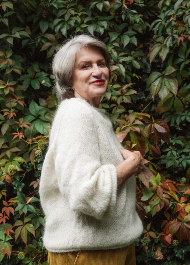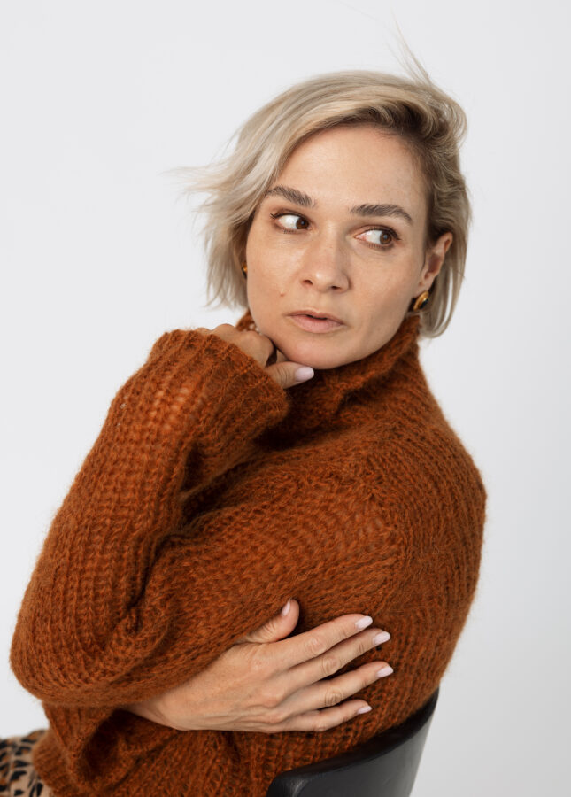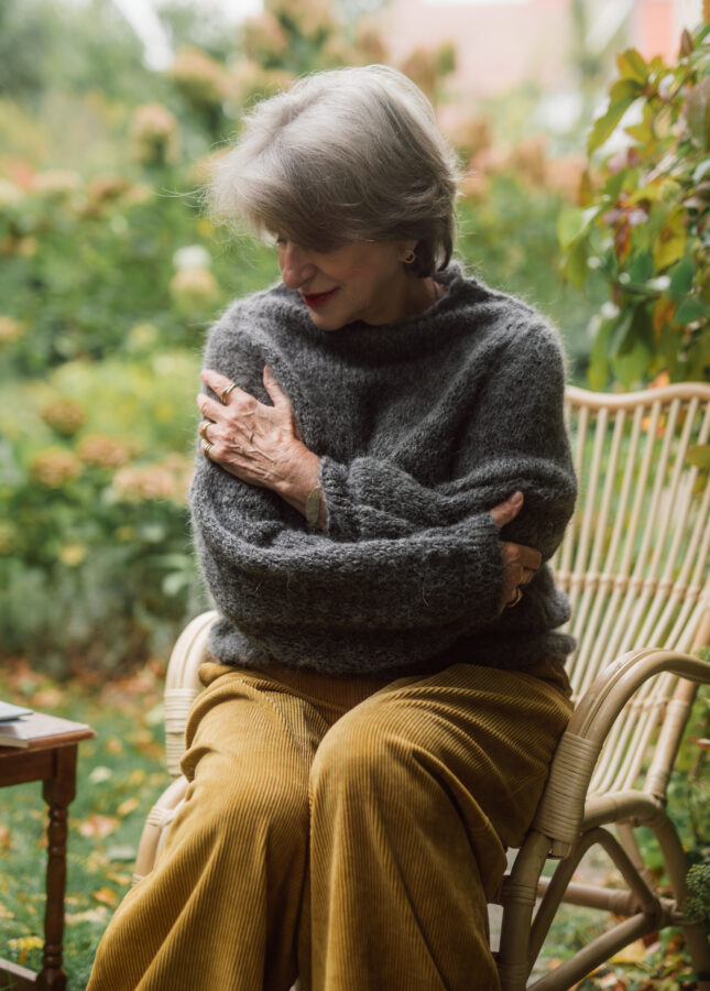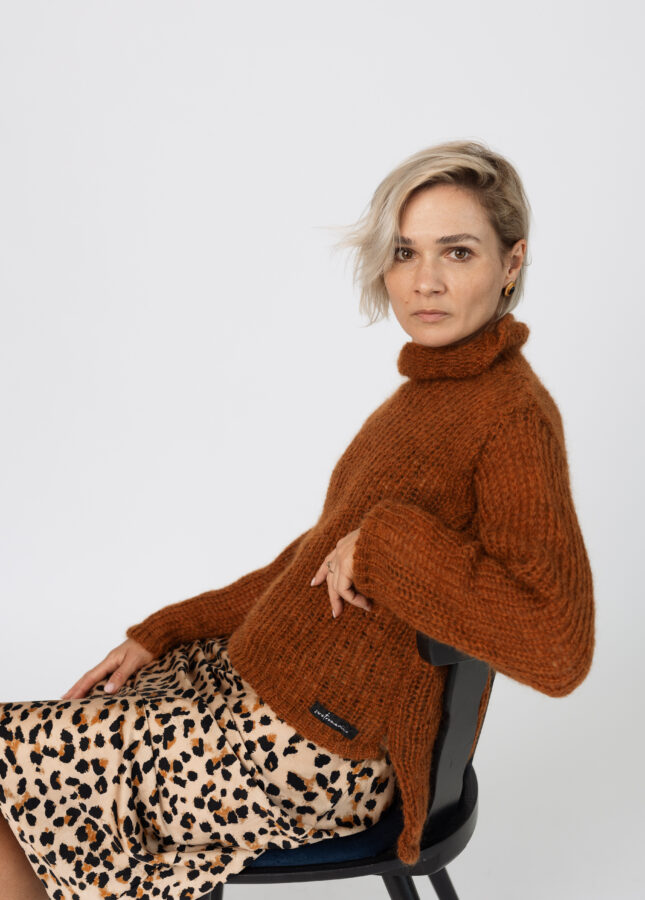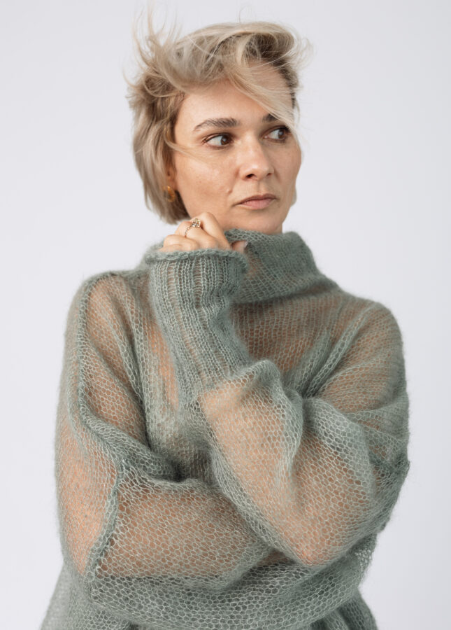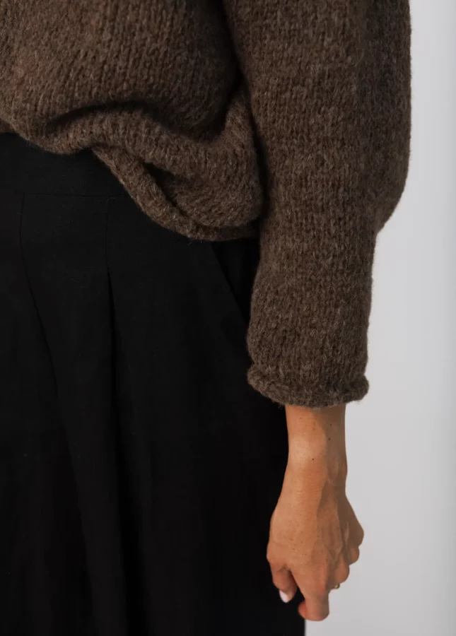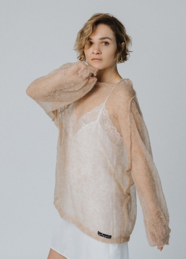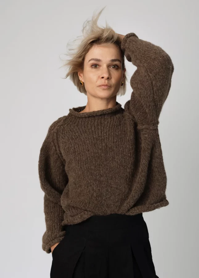 Puszysty sweter wykonany z podwójnej lub potrójnej przędzy moheru z jedwabiem z dekoltem w serek (Stella 2)