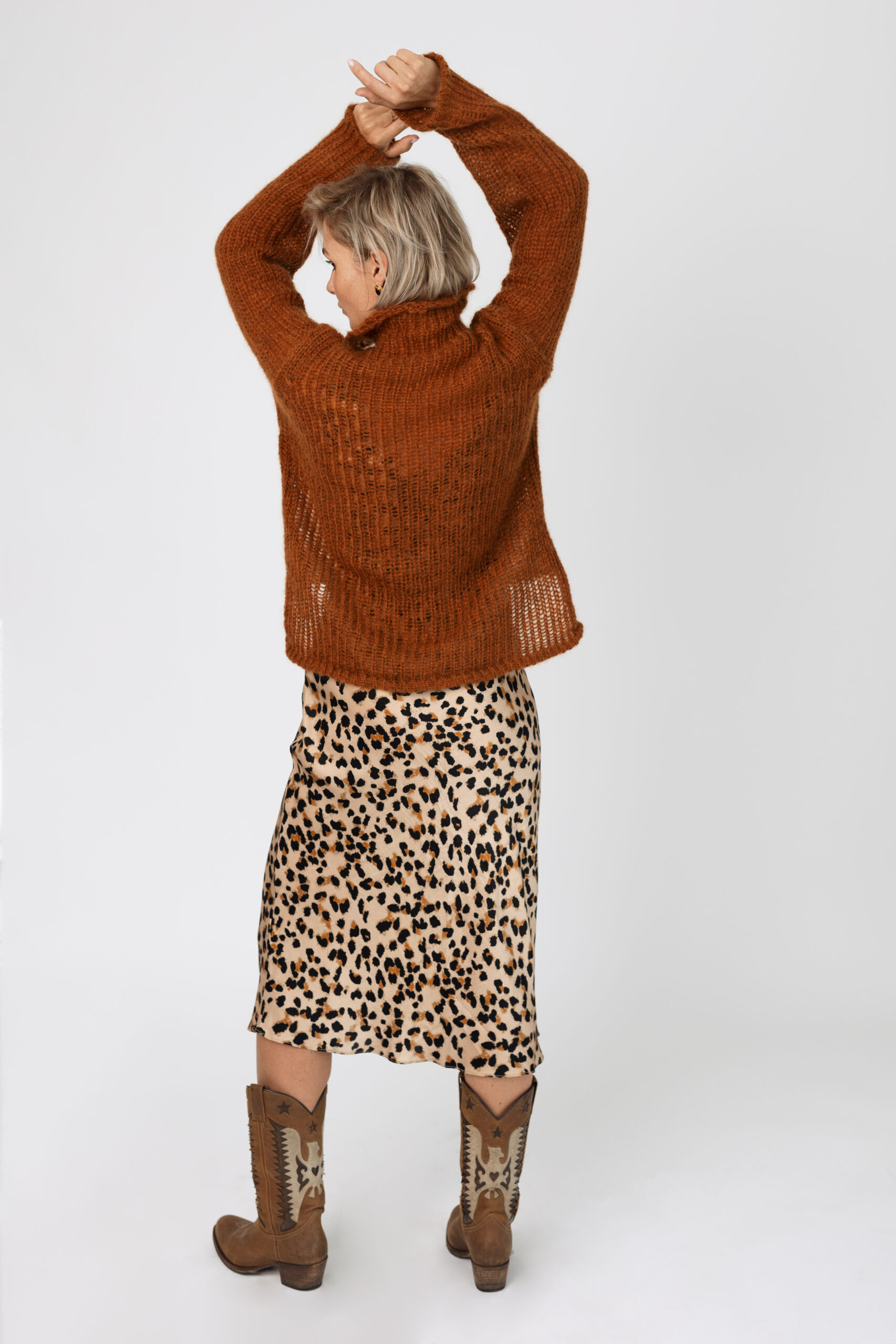 Prosty, nowoczesny fason, rękaw z przeszyciami na wierzchu, wykończony pod szyją golfem. Rękawy zakończone mankietem (z wrabianym wzorem lub bez). Puszysty sweter wykonany z podwójnej lub potrójnej przędzy moheru z jedwabiem dekolt wykończony golfem.