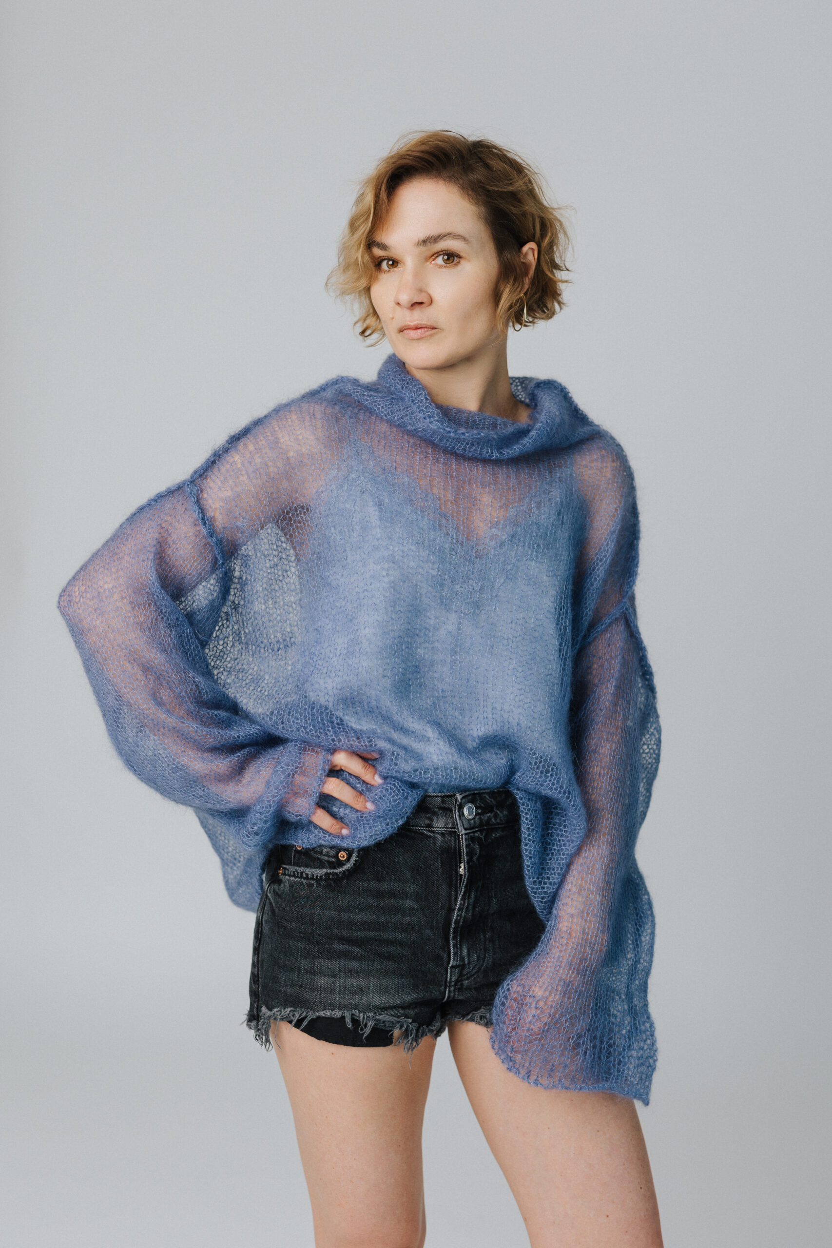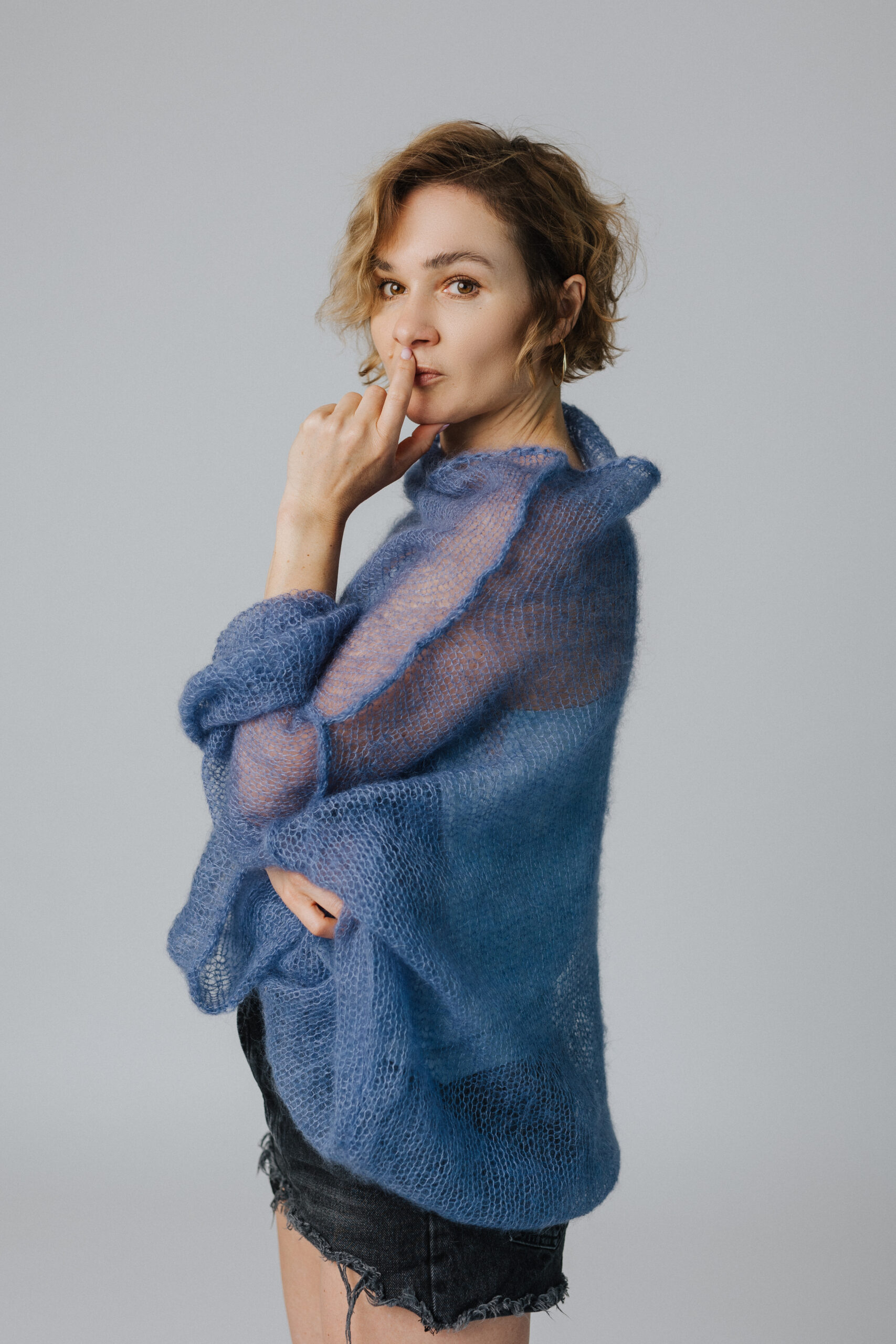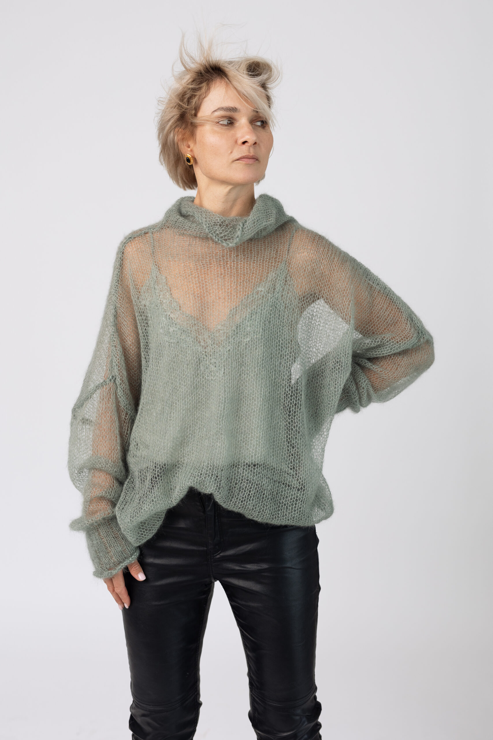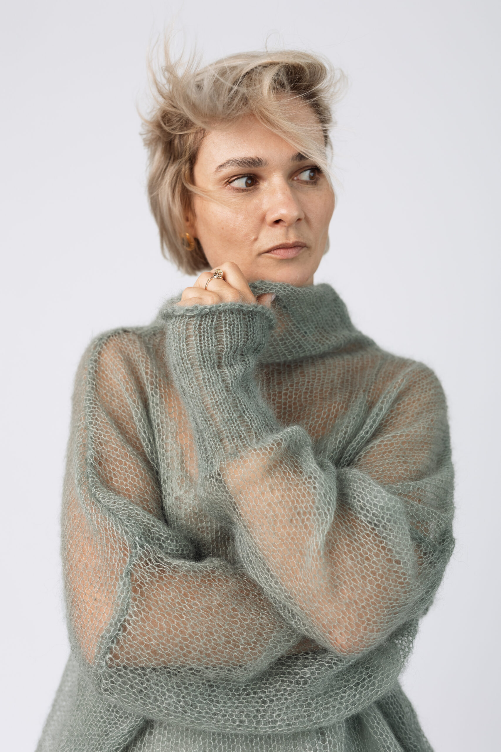Prosty, nowoczesny fason, rękaw z przeszyciami na wierzchu, wykończony pod szyją golfem. Rękawy zakończone mankietem (z wrabianym wzorem lub bez). Mgiełka wykonana z pojedynczej przędzy moheru z jedwabiem, dekolt wykończony półgolfem.