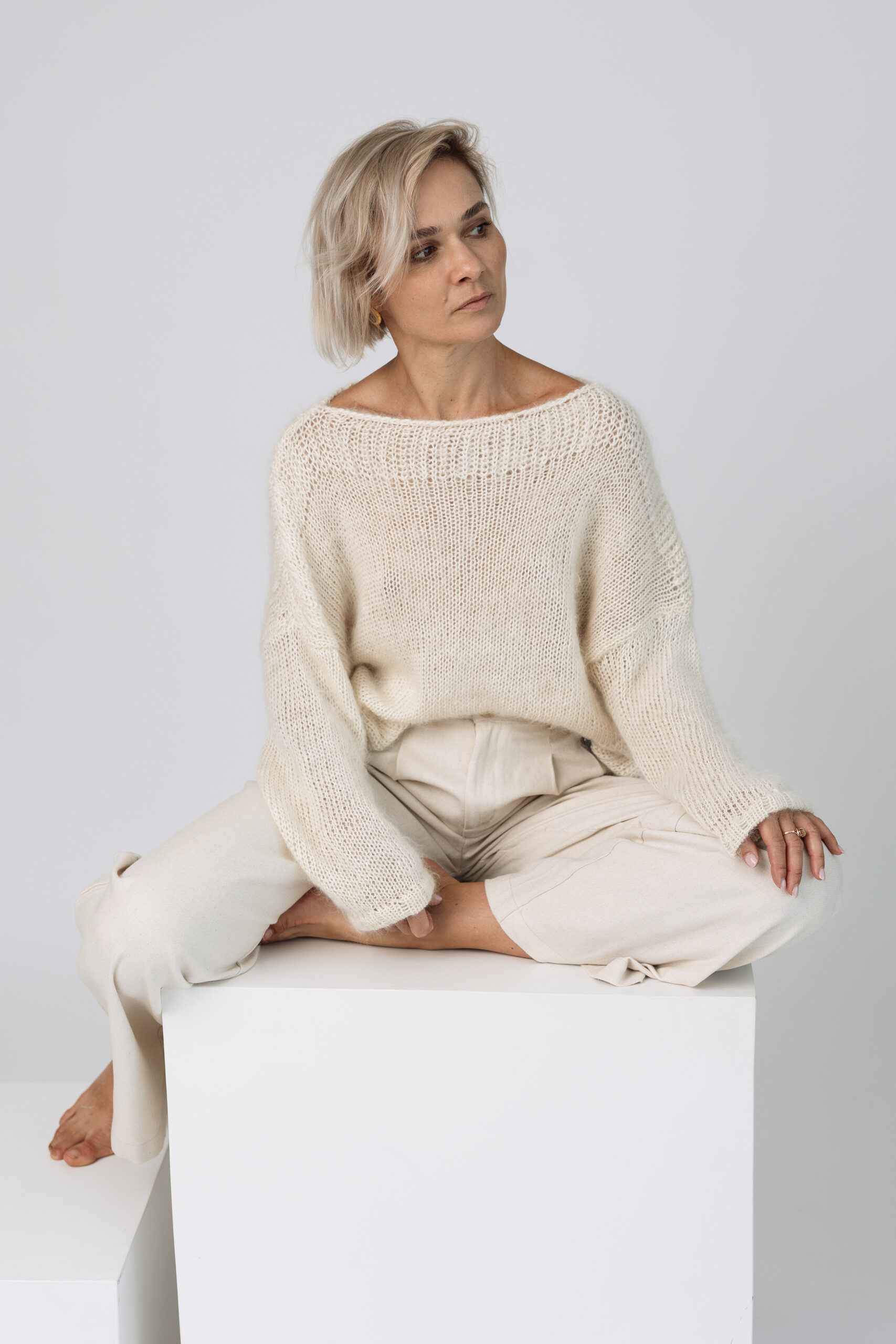 Delikatny sweter a’la mgiełka z dekoltem wykończonym w łódkę.